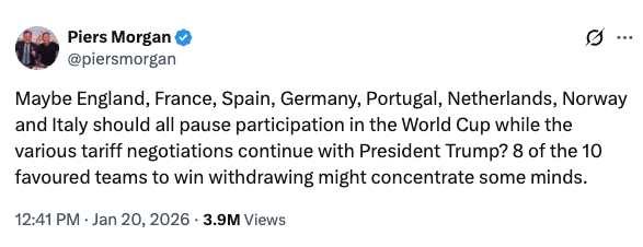 La liste la plus explicite est avancée par Piers Morgan. Le journaliste britannique, décrit comme proche de Donald Trump, a publié sur les réseaux sociaux une proposition de “suspension” de participation pendant que se poursuivent des négociations tarifaires avec le président américain. Il cite : l’Angleterre, la France, l’Espagne, l’Allemagne, le Portugal, les Pays-Bas, la Norvège et l’Italie.
