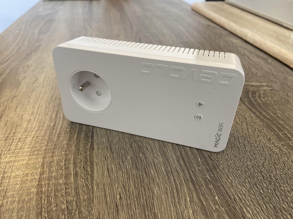 Le signal circule entre les deux via le réseau électrique à un débit allant jusqu’à 3000 Mbit/s grâce à la technologie Powerline. Comme le précise Devolo, « chaque prise de courant dans la maison devient un point d’accès au réseau ». Le boîtier WiFi rediffuse ensuite le signal en WiFi 6 dual-band (2,4 GHz et 5 GHz simultanément) via quatre antennes, pour un débit WiFi théorique agrégé de 3 000 Mbit/s. Bien entendu, vous pouvez relier vos appareils de manière filaire. Chaque boîtier WiFi dispose de deux ports Ethernet Gigabit pour y raccorder un PC fixe ou une console, et intègre une prise gigogne qui restitue la prise murale. Un détail appréciable quand les prises sont rares.